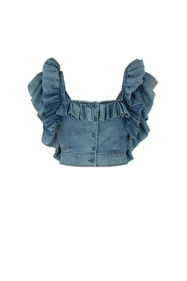 SAVANNAH WASHED DENIM BACKLESS RUFFLED TOP