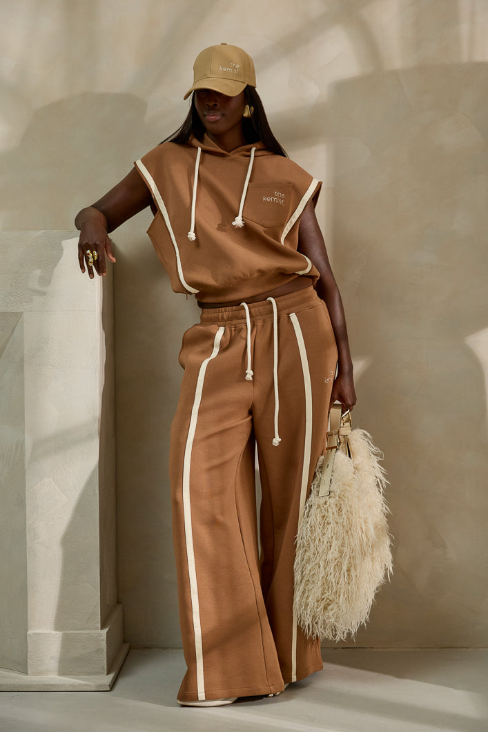 Now in a beautiful light brown and white colouring, welcome in the Miyako Wide-leg Athluxe Pants with striking contrast stripes. Pair with the matching Miyako Luxe Hoodie for a luxuriously comfortable, customisable fit.